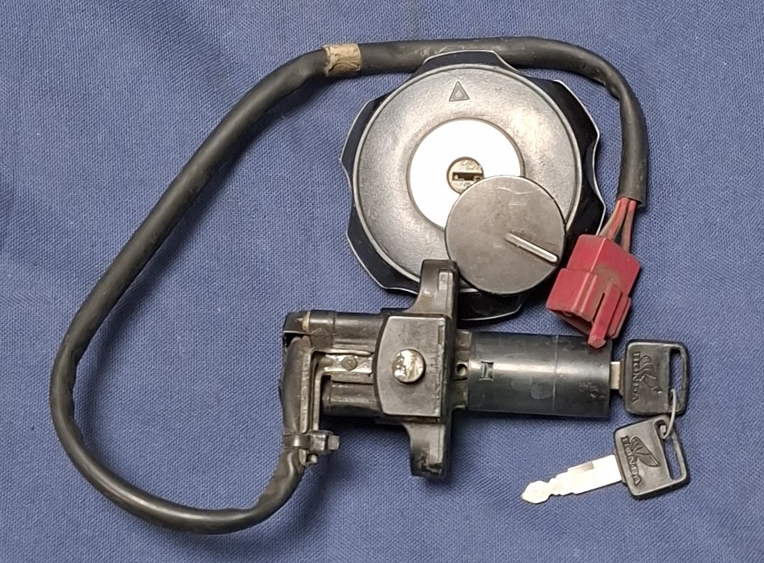Bouchon de réservoir d’essence et contacteur à clef de type Neiman pour HONDA XLV 600 Transalp avec ses deux clefs d’origine.