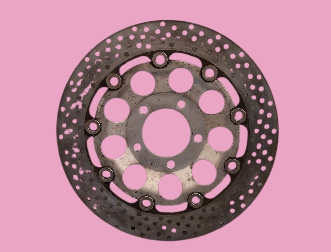 Disque de frein avant côté droit de SUZUKI 750 GSX F de 1993 se montant également sur les 600 GSX Katana ainsi que d’autres modèles et cylindrées, les cotes sont les mêmes seuls changent la couleur de la flasque et le perçage anti pluie qui est moins dense.